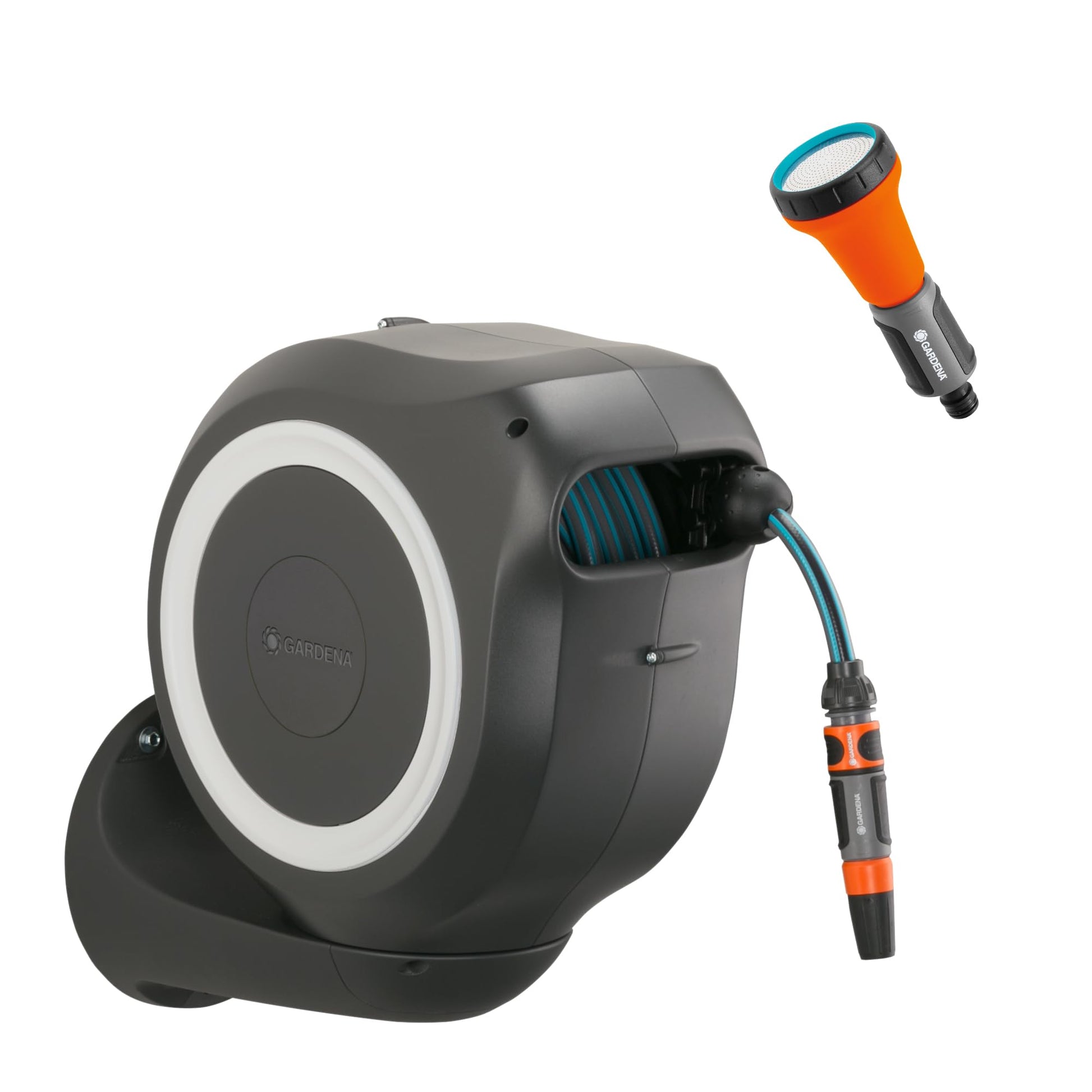 Gardena Wand-Schlauchbox RollUp M 20 m: Flexible Bewässerung für mittelgroße Gärten, schwenkbare Schlauchtrommel, mit Wandhalterung, Systemteilen und Spritze inkl. 20 m Gardena Schlauch (18612-20)