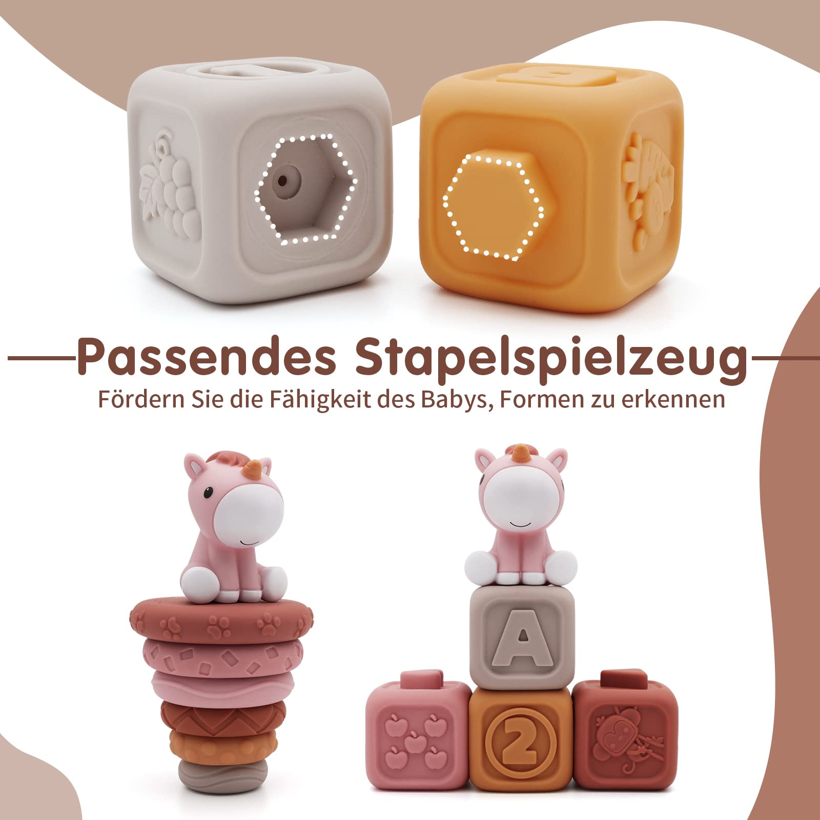 The blocks are made of soft, chewable, food-safe silicone —perfect as a teething aid for teething pain. Thanks to the air hole, they make a gentle noise when pressed, stimulating hearing development . The set is easy to clean and ideal for small hands.