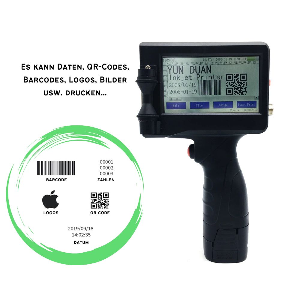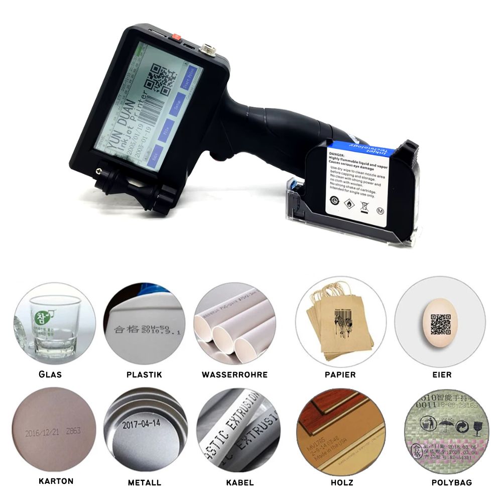 This handheld touch inkjet printer is perfect for printing on cartons, plastic bags, labels, IC/IP cards, ceramics, glass bottles, wires and metal caps. It allows you to print QR codes, barcodes, texts, symbols, dates and logos - everything you need for your products!