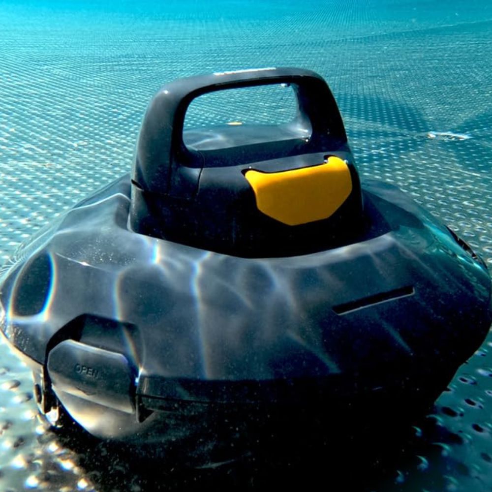The gray pool robot boasts a powerful 5,200 mAh lithium-ion battery for up to 110 minutes of cordless cleaning . Thanks to two powerful motors and a pump output of 5,200 l/h, it effectively removes dirt and ensures crystal-clear water.