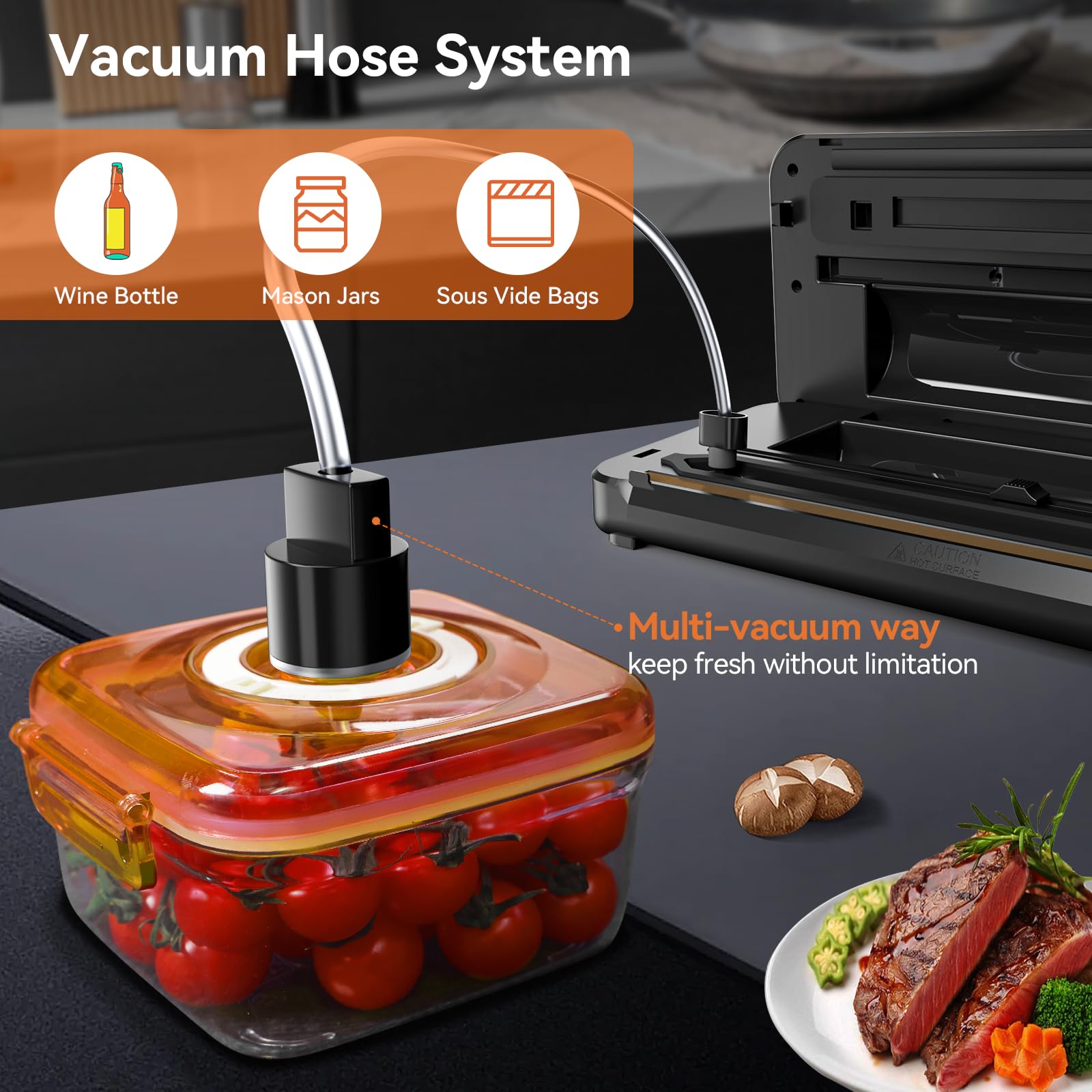 The Pyukix vacuum sealer offers 8 functions in one device to keep your food fresh and extend its shelf life. With dry and moist modes, you can vacuum and seal a variety of foods such as meat, seafood, fruits, vegetables, nuts, bread, and more , extending their freshness by up to 10 times . Additionally, the vacuum hose accessory allows you to seal wine bottles and jars.