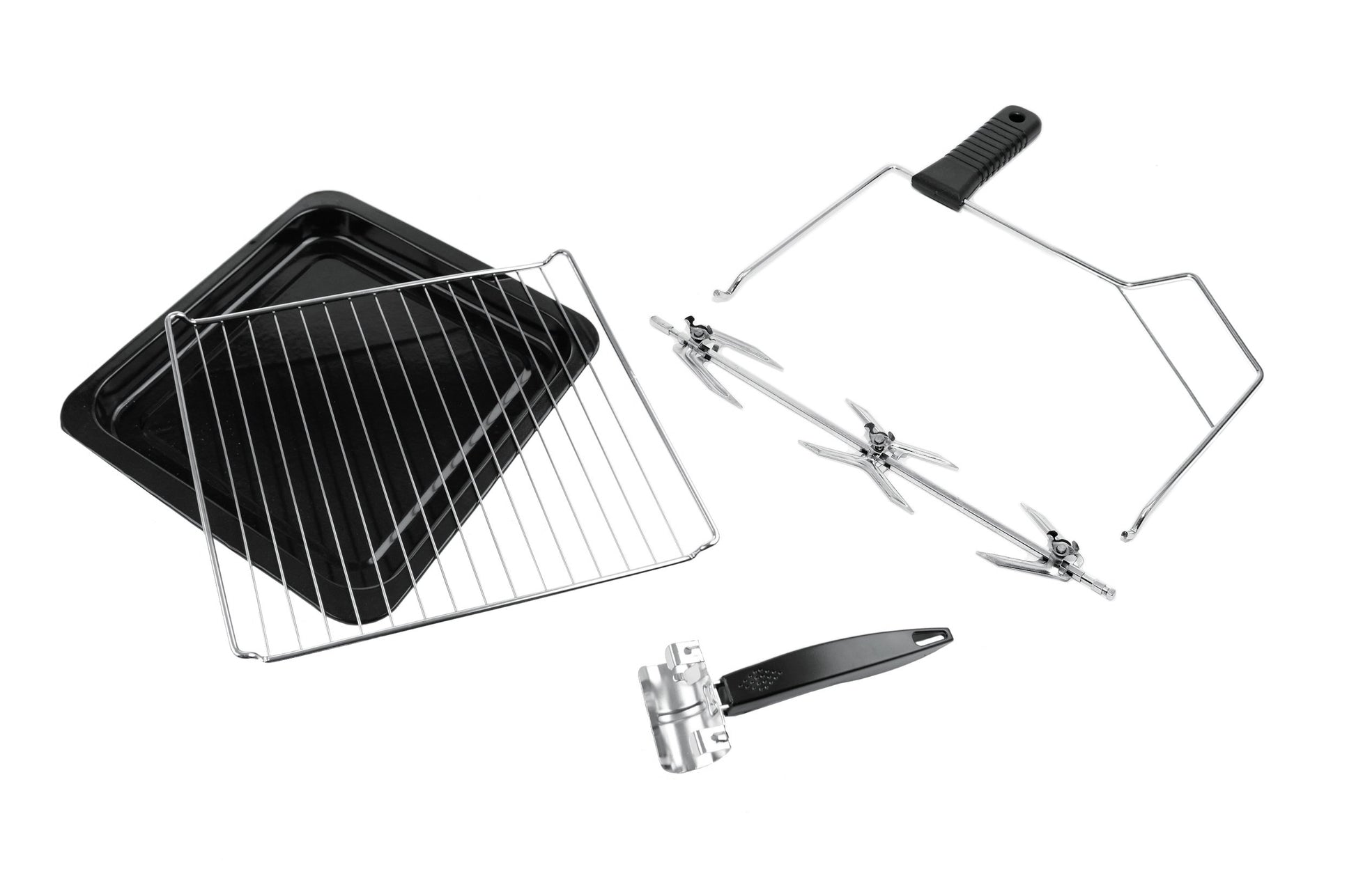 Mit dem motorischen Drehspieß können gleichzeitig zwei Hähnchen oder Spießbraten gegrillt werden, während die 120 Minuten Zeitschaltuhr und der Signalton für eine präzise Zubereitung sorgen. Der beleuchtete Backraum mit einer pflegeleichten Antihaftbeschichtung und der 2-fach verglasten Backofentür erleichtern die Reinigung. Zudem bietet der Ofen 4 Einschubebenen und einen Überhitzungsschutz für zusätzliche Sicherheit.