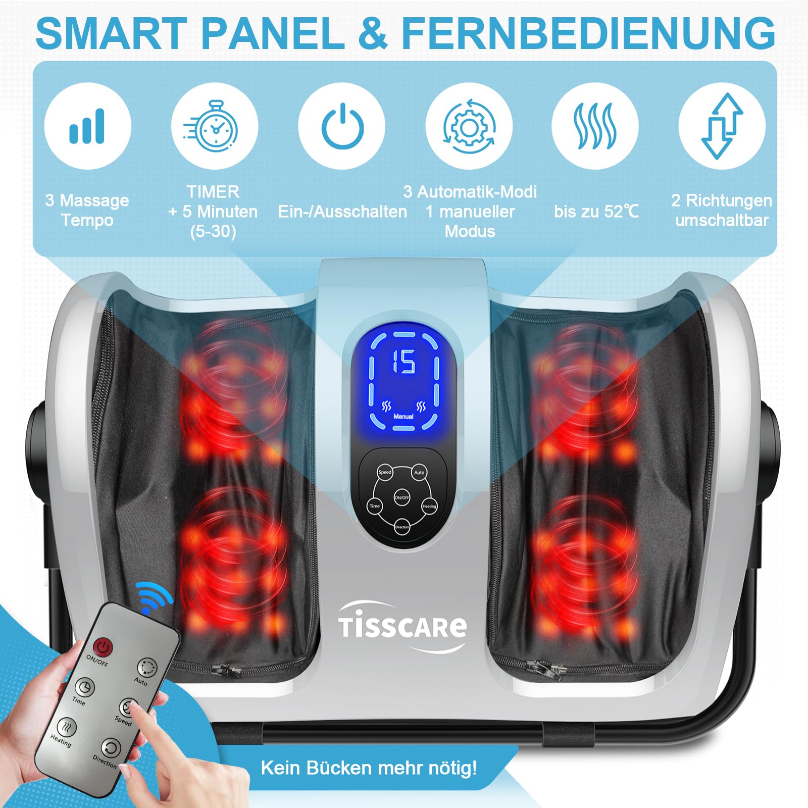 Genießen Sie eine tiefgehende Shiatsu-Massage mit dem TISSCARE Fußmassagegerät, das Ihre Füße, Knöchel, Waden, Beine und Arme wie die Hände eines professionellen Masseurs massiert. Es hilft, Muskelsteifheit und Müdigkeit zu lindern, die Durchblutung zu fördern und Beschwerden wie Plantarfasziitis zu reduzieren. Mit 4 Massage-Modi, einer Timerfunktion (5-30 Minuten) und einstellbaren Geschwindigkeiten und Massagerichtungen können Sie die Massage ganz nach Ihren Bedürfnissen anpassen.