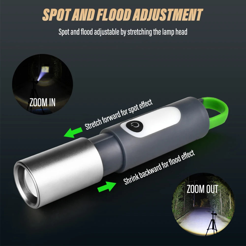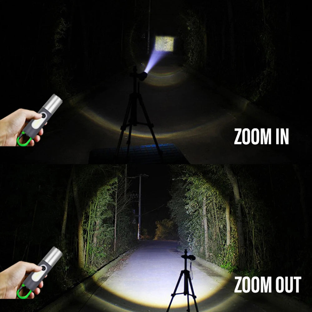 Zoom télescopique : tirez simplement la tête de la lampe pour basculer entre l'éclairage longue distance et l'éclairage rapproché. Parfait pour des faisceaux de lumière précis ou larges.