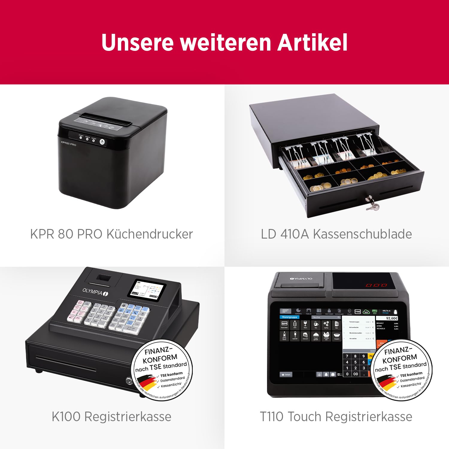 Das Olympia TS10 ist ein kompaktes und bedienerfreundliches Kassensystem, das sich ideal für den Einsatz in Gastronomie und Einzelhandel eignet. Ob im Café, Restaurant oder Ladengeschäft - dieses System bietet alle grundlegenden Funktionen für einen reibungslosen Ablauf direkt am Point of Sale - ganz ohne PC oder externe Software.