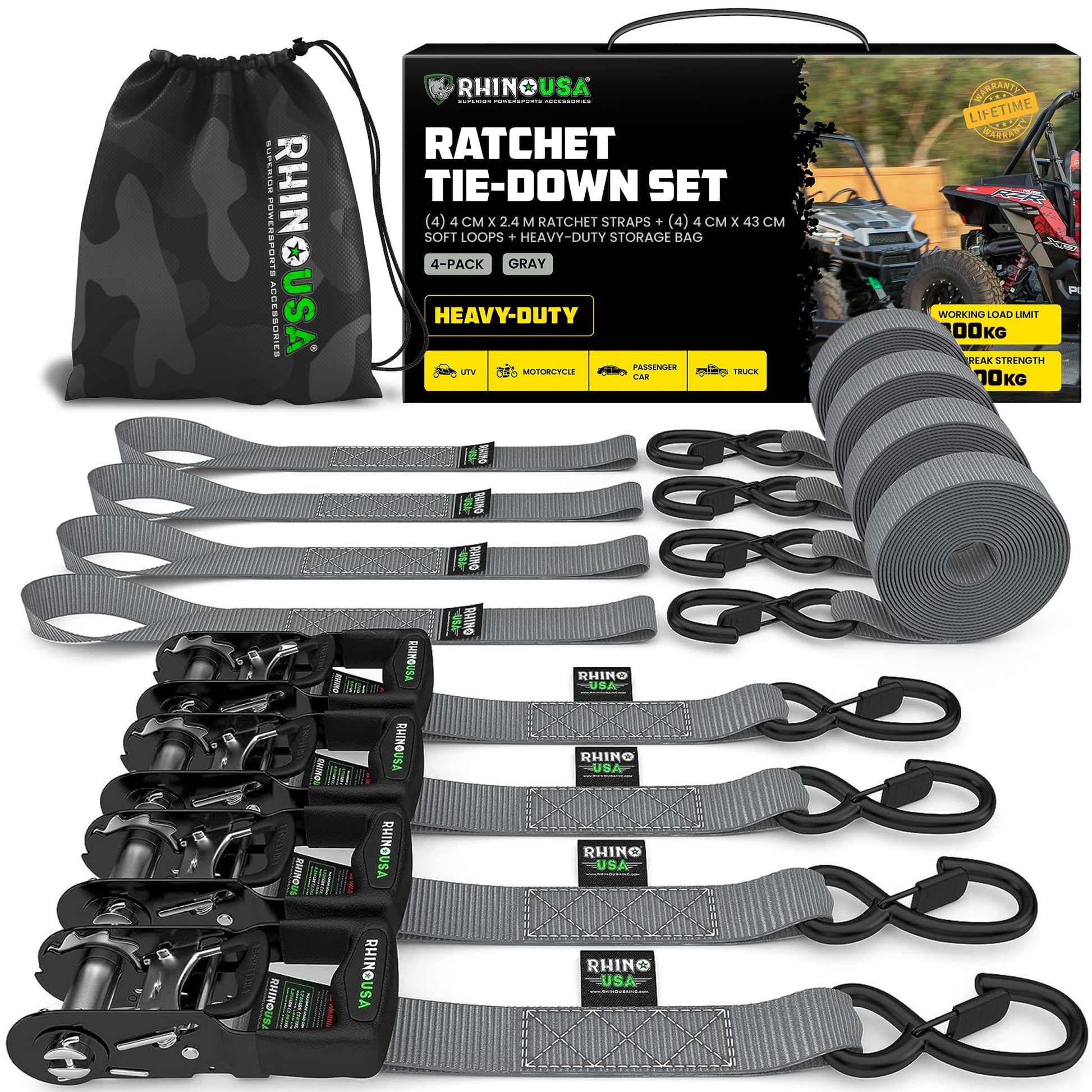 Rhino USA Spanngurte mit Ratsche und Haken (4er Pack): 2000kg Reißfestigkeit in Grau