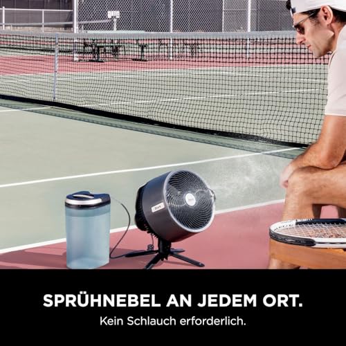 Lieferumfang: Ventilator, Standfuß, Sockel, tragbarer Sprühtank, Ladekabel, Fernbedienung