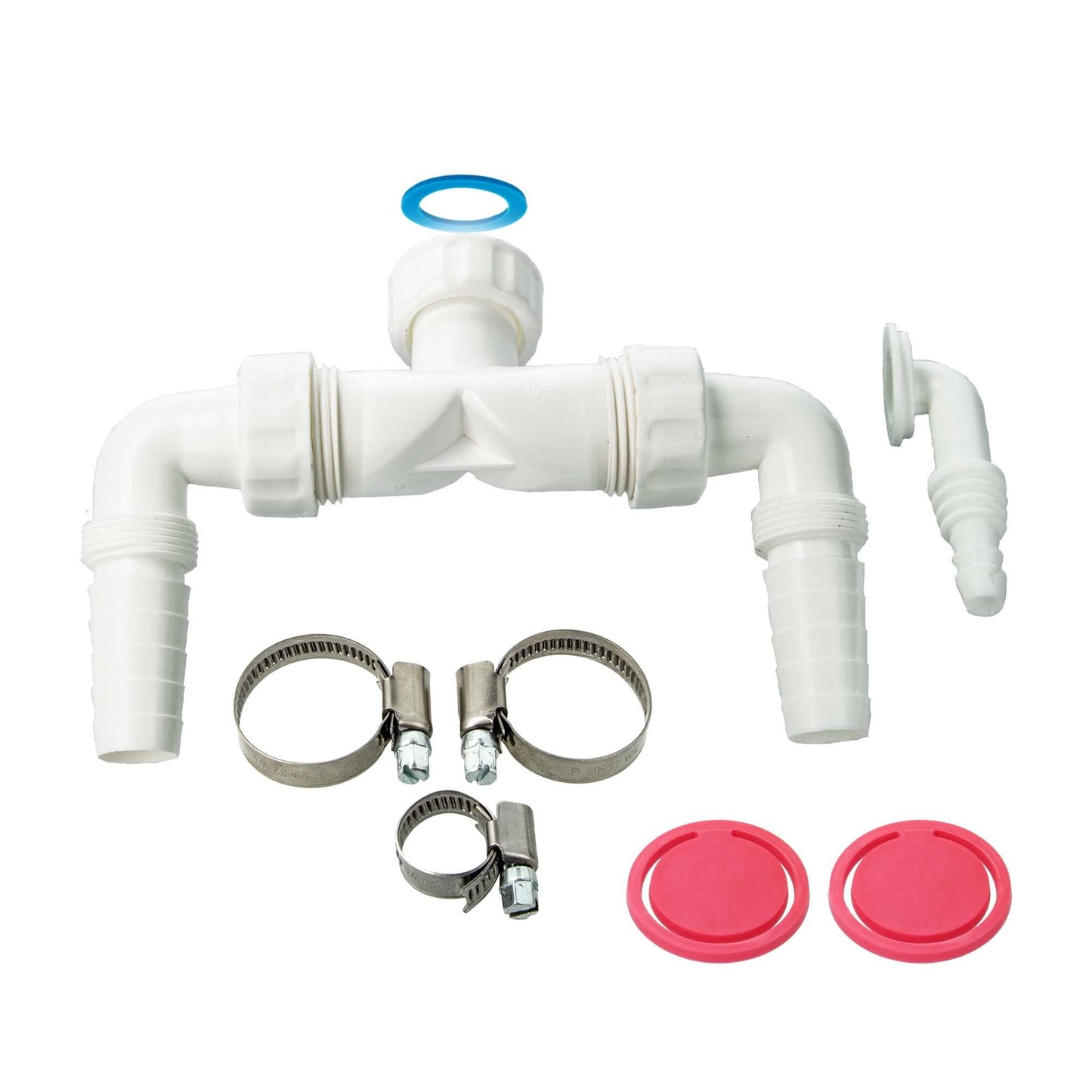 Mit zwei Winkelschlauchtüllen (Ø 18-23mm) und einer zusätzlichen Kondensatschlauch-Tülle (Ø 8-17mm) eignet sich der Anschluss ideal für Haushalte mit mehreren Geräten. Inklusive Schlauchschellen für eine einfache und sichere Montage.