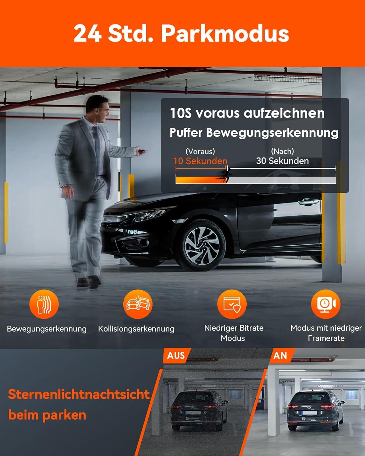 Parkmodus mit 10s Puffer: Bewegungserkennung mit Voraufnahme - spart Speicher und schützt das Fahrzeug auch im Stand