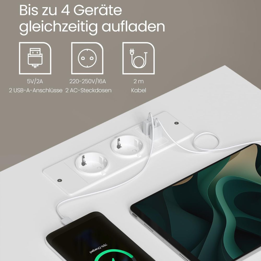 - Integrierte Ladestation: 2 USB-Anschlüsse & 2 Steckdosen - ideal für Handy, Tablet & Co.