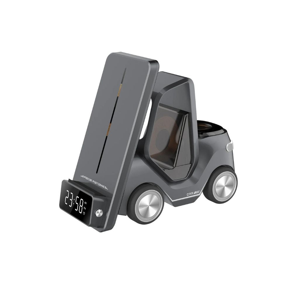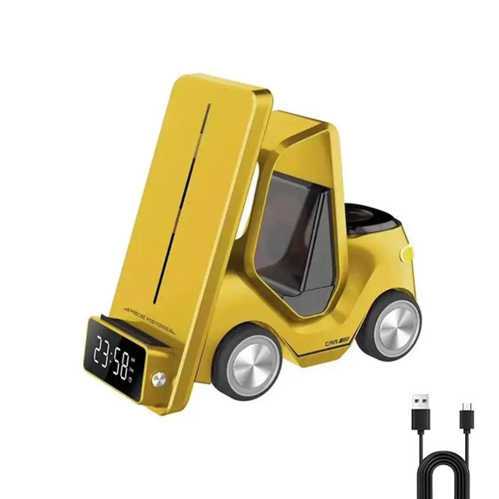 Entdecken Sie die ultimative 5-in-1 Wireless Lade- und Weckstation in Gabelstapler Design - die perfekte Ergänzung für Ihren modernen Lebensstil.