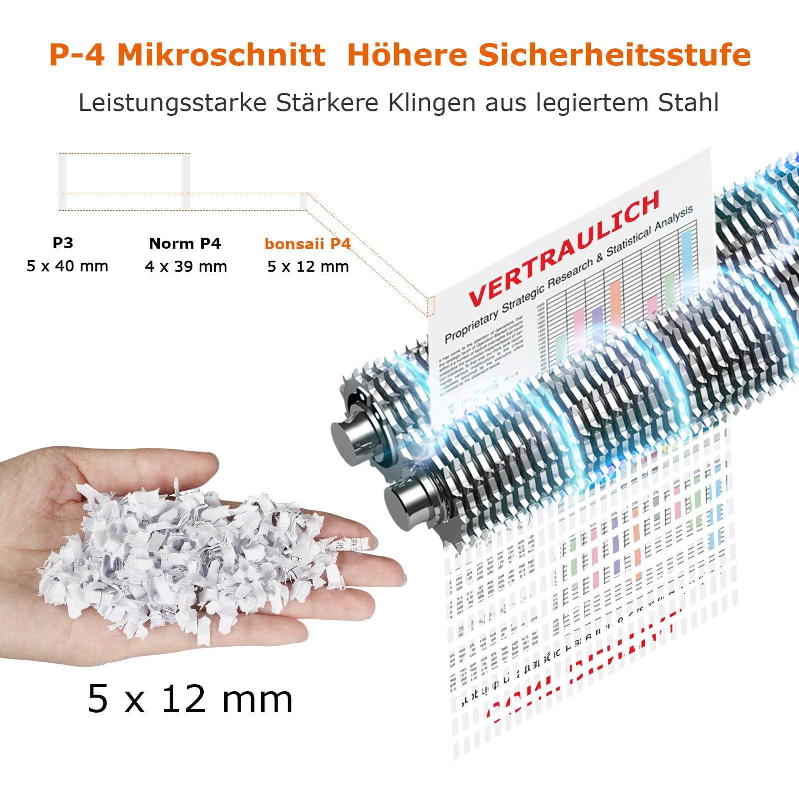 • [ P-4 Hochsicherheitsstufe ] Mikroschnitt-Aktenvernichter für Bürogebrauch, zerkleinern Sie nicht nur 12 Blätter auf einmal zu winzigen Partikeln von 5 x 12 mm, sondern auch CDs, Kreditkarten, E-Mails, Heftklammern und Büroklammern. Maximale Sicherheit für Ihre sensiblen Informationen