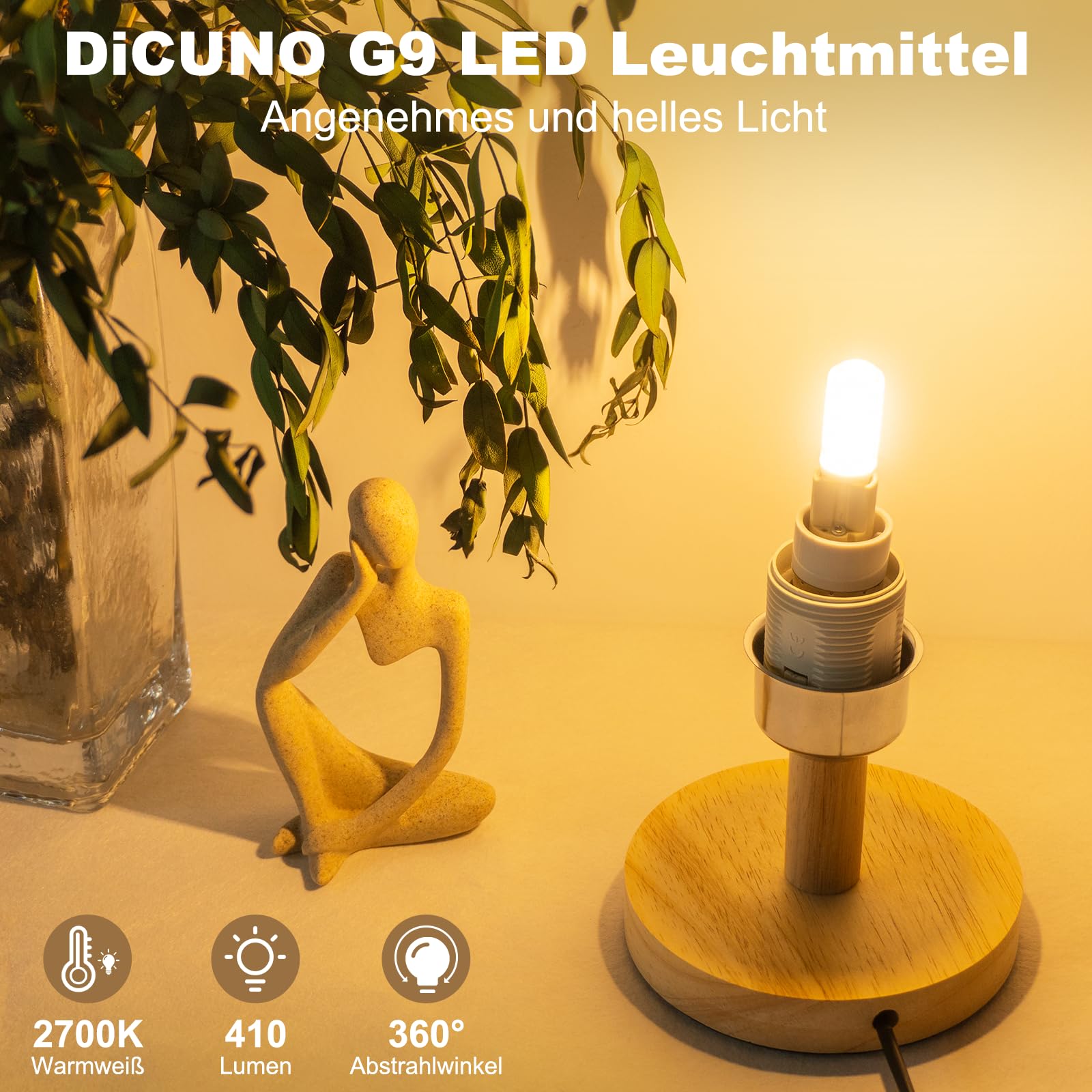 Die DiCUNO G9 LED Lampe im Warmweiß 2700K-Ton bietet mit 410 Lumen und einem 360° Abstrahlwinkel angenehmes Licht, das eine 40W-Halogenlampe ersetzt. Sie spart bis zu 92,5% Energie und überzeugt mit einer langen Lebensdauer von 25.000 Stunden.