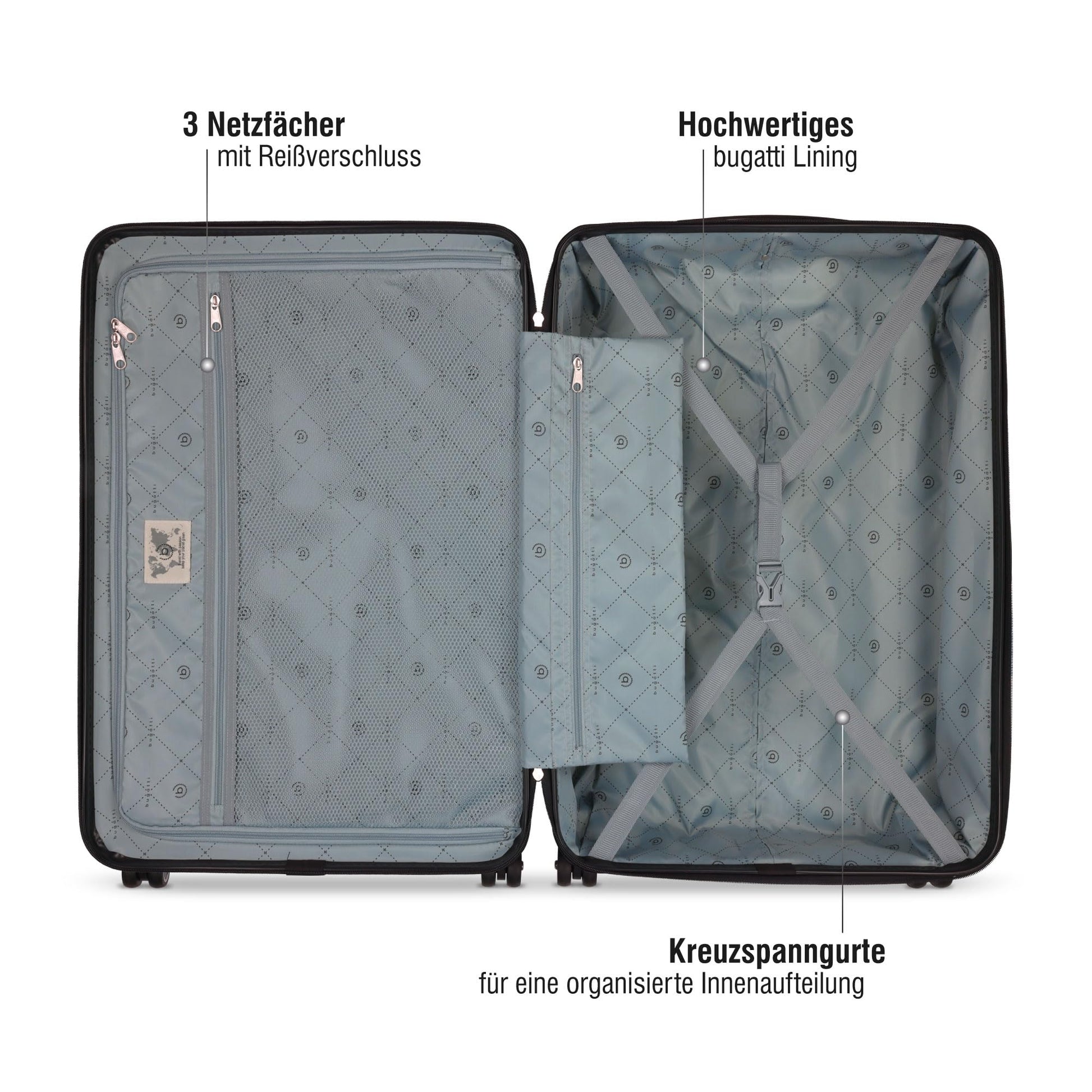 - Innen: RV-Fach, Organisationsfach & Spanngurte mit Bajonettverschluss